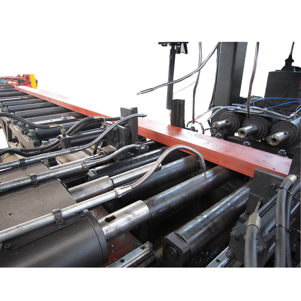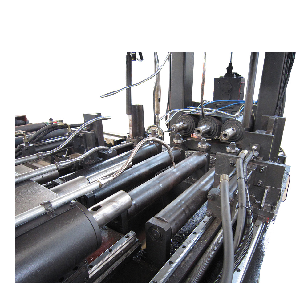 本機(jī)床主要用于H型鋼、槽鋼和箱型梁的鉆孔加工,廣泛用于立體車庫、鋼結(jié)構(gòu)建筑、橋梁、塔桅和網(wǎng)架等行業(yè)。4軸數(shù)控型鋼三維鉆床采用四個伺服電機(jī)實現(xiàn)2個垂直方向、1個水平方向和1個長度的鉆孔定位。3個鉆孔面上,每個面有3個鉆孔主軸,每個面上的3個鉆孔主軸由一臺變頻電機(jī)驅(qū)動,鉆孔主軸為自控行程鉆孔主軸,工件一次通過設(shè)備后三個面上的孔均可加工完畢,效率高,孔位精度高,是鋼結(jié)構(gòu)制造業(yè)中保證質(zhì)量的必不可少的設(shè)備。