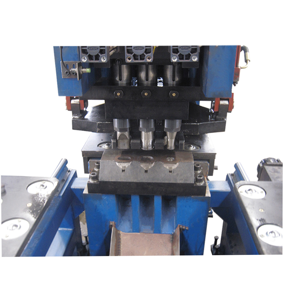 機身為C型鋼板焊接結(jié)構(gòu),剛性好,操作空間大。本機設(shè)有三個模位(其中有一個打字工位),模位切換自動進行。夾鉗系統(tǒng)能適合不同厚度的工作,設(shè)有基準零位擋塊,工件由滾球工作臺支撐。X軸及Y 軸運行由伺服電機及滾珠絲杠驅(qū)動,由雙軸數(shù)控系統(tǒng)控制沖孔位置。整個加工過程自動進行,操作者把工作尺寸輸入計算機,以后可以反復調(diào)用。